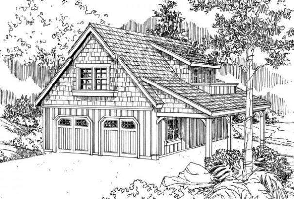 This Craftsman garage plan can park up to three cars. On the left side of the garage there are two doors, one is 10' wide and 10' tall while the other is 16' wide and 10' tall. The garage door on the right side is 9' wide and 10' tall. Upstairs there is a large attic with balcony.