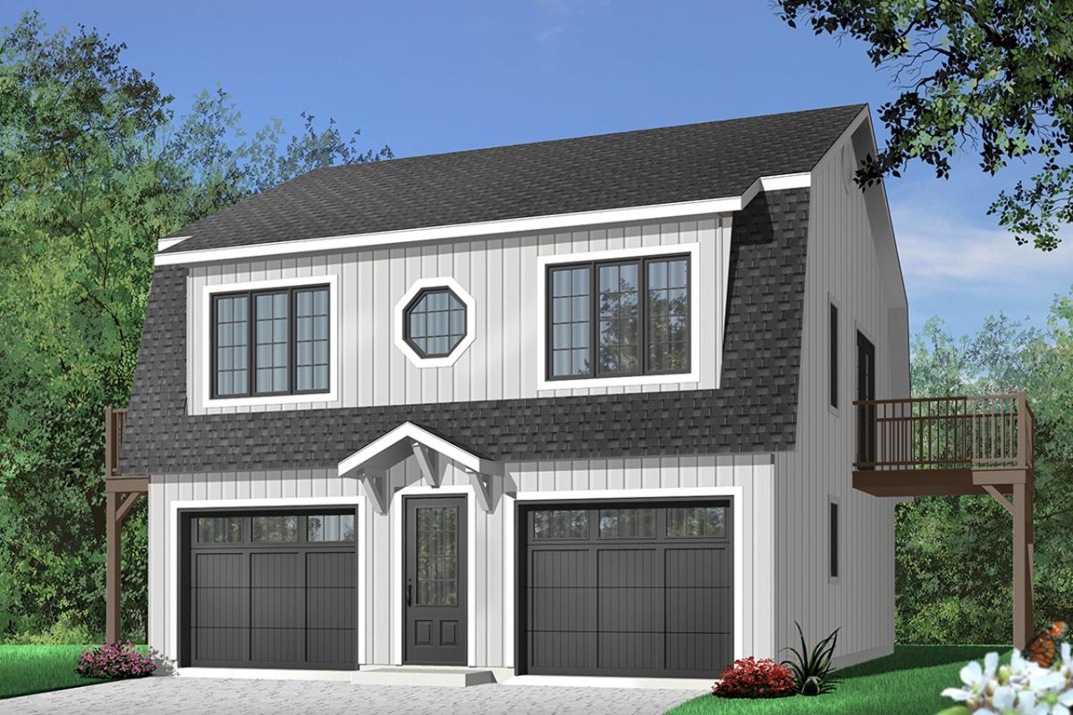 Looking for a barndominum plan under 1000 square feet? Look no further than the Hillock. At 992 square feet this design offers a 2 car garage on the main floor and a 2 bedroom apartment on the second. In addition to the car storage on the first floor, a half bathroom is tucked away under the stairs which are closed off from the garage. The stairs run through the middle of the living area, providing some separation between the living room and the kitchen with built-in dining area. A rich display of windows along the front insure that the living area and kitchen are filled with light. At the back of the second floor are two bedrooms laid out as jack-and-jill suites, sharing direct access to the compartmentalized bathroom. Each suite also has a private balcony.